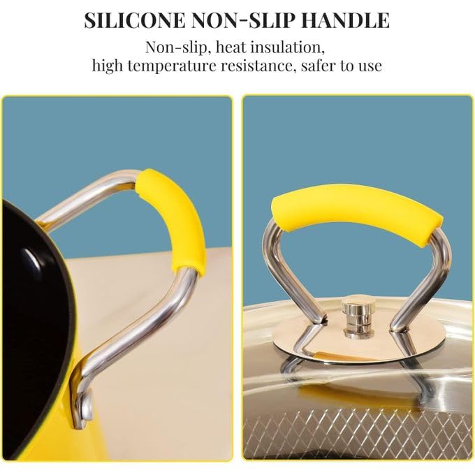 - LARGE CAPACITY: Spacious yellow stockpot design ideal for family-sized portions, featuring heat-resistant handles for safe handling