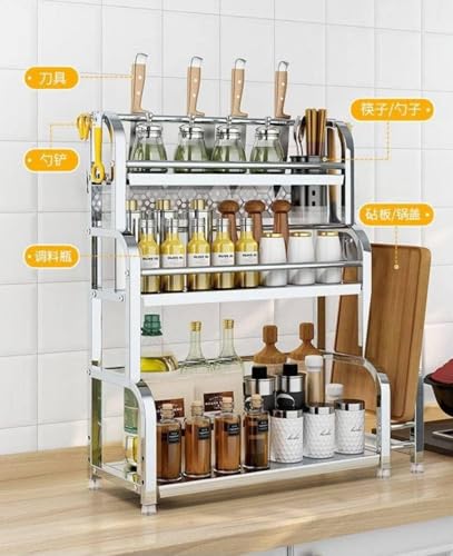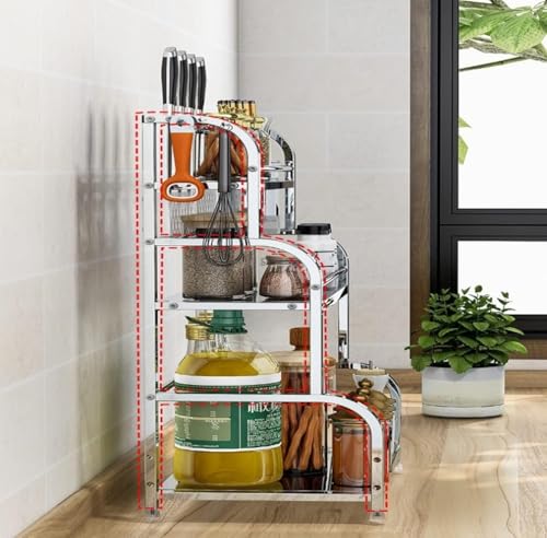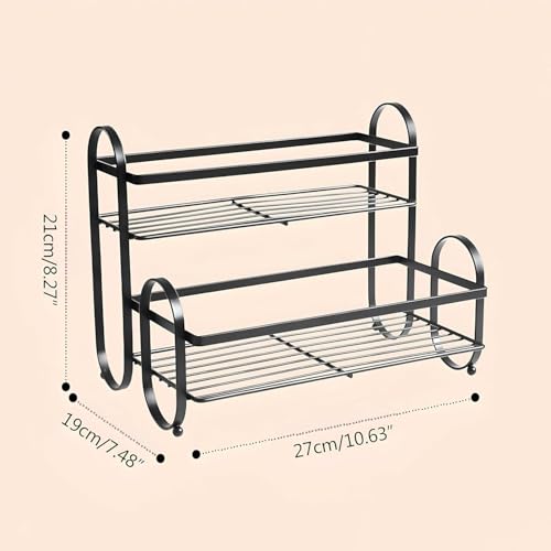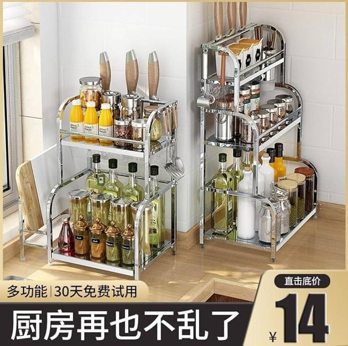- It has two handy shelves to organize various kitchen items, such as seasonings, tins, and toiletries.