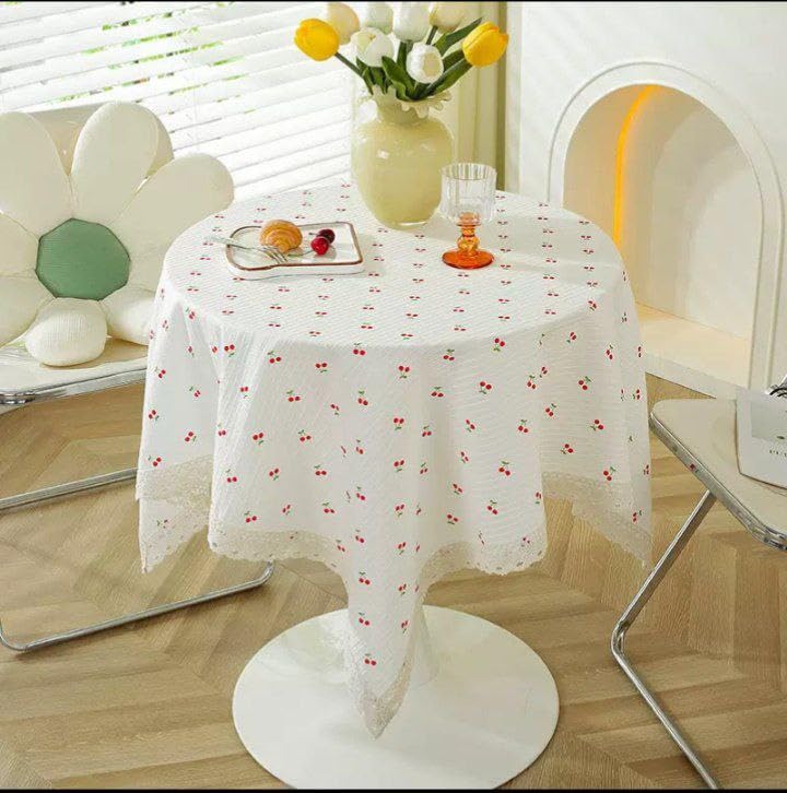 - تصميم أنيق: يتميز بنمط زهور ساحر مع زخارف كرزية حمراء رقيقة على خلفية بيضاء واضحة، تكملها حواف دانتيل جميلة لإضفاء لمسة كلاسيكية وأنثوية