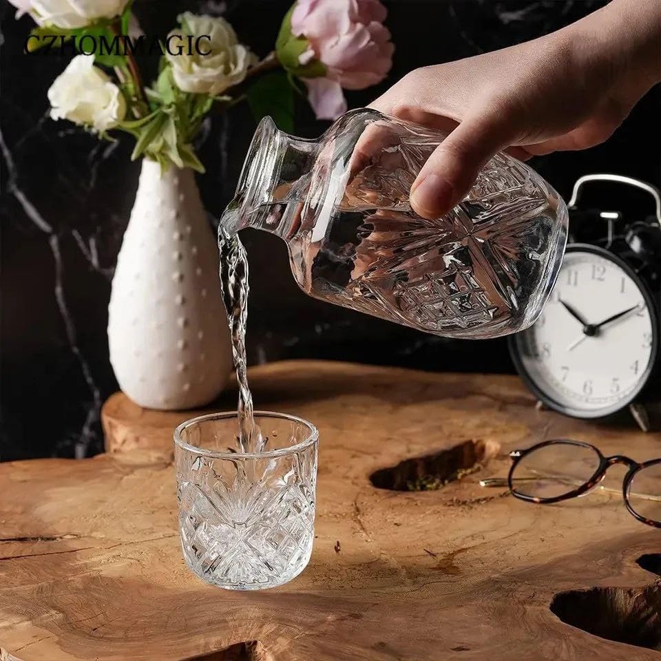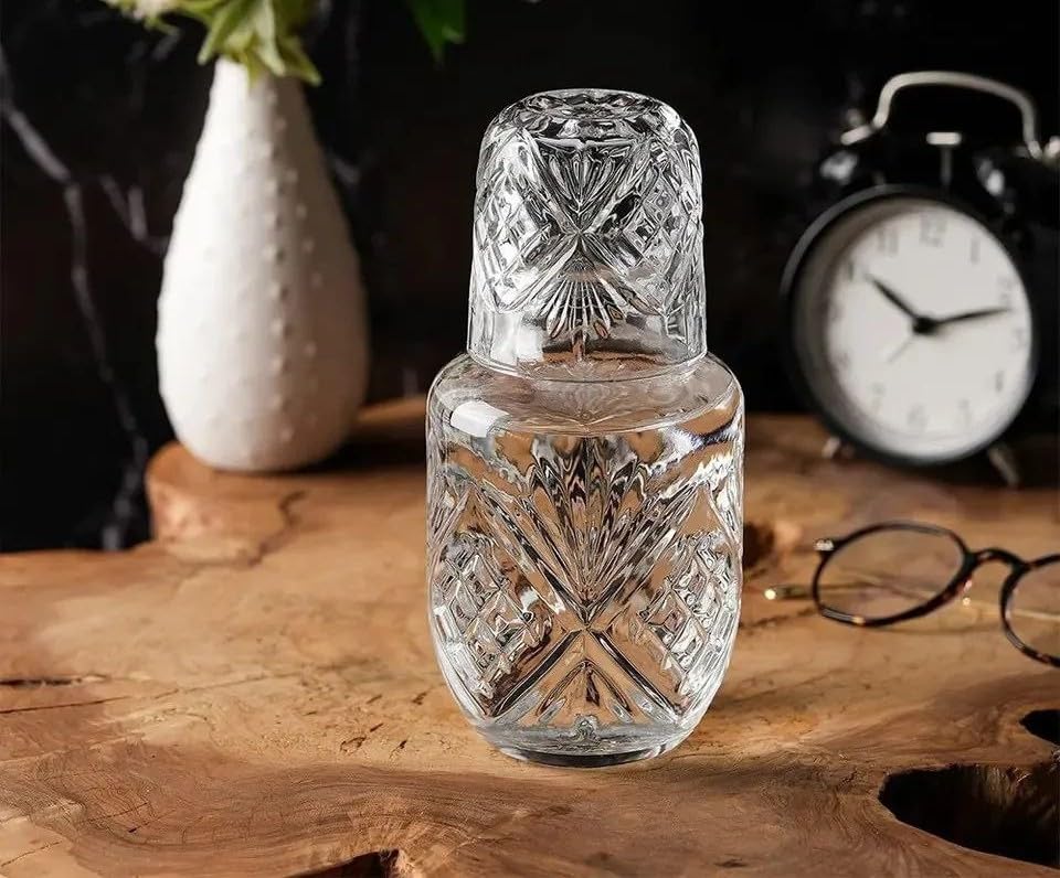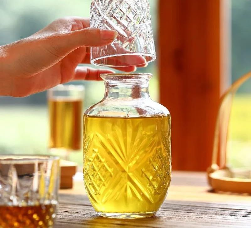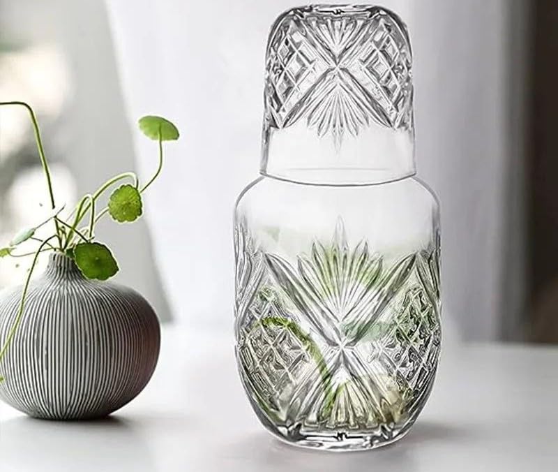 - ELEGANT DESIGN: Beautiful glass bottle features an intricate decorative pattern with a matching crystal-cut cup lid that doubles as a drinking glass for convenient serving