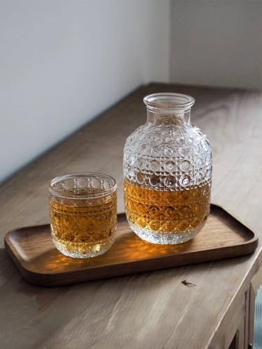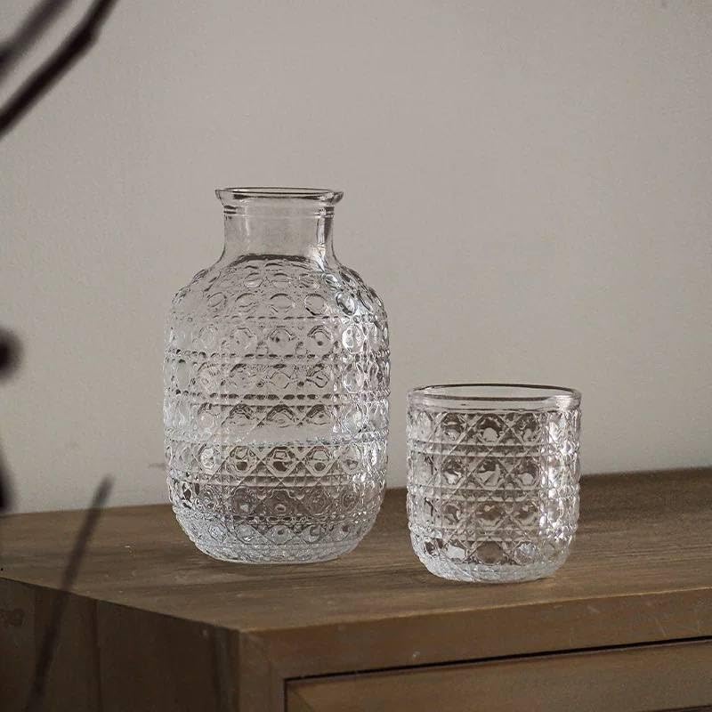 - طقم إبريق كامل: يتضمن إبريق زجاجي سعة 525 مل مع كوب بنقش مطابِق، مثالي لتقديم الماء أو العصير أو الشاي أو المشروبات الأخرى بجانب السرير أو على طاولة الطعام.