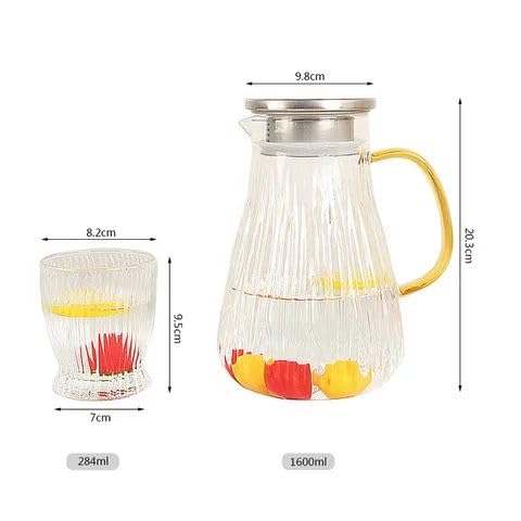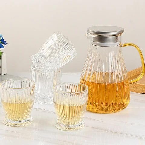 - Glass Pitcher and Cups Set, 5-Piece, Ribbed Design with Stainless Steel Lid, Gold Handle