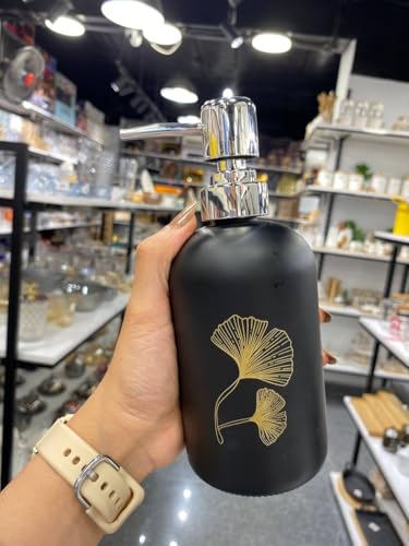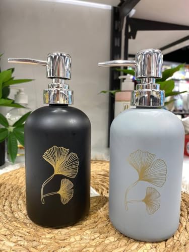 - ELEGANT DESIGN: Set of 2 glass soap dispensers featuring beautiful gold ginkgo leaf design on frosted matte finish bottles in black and white colours