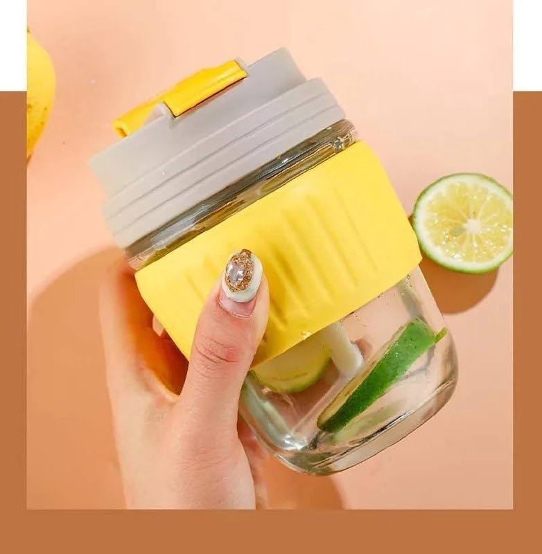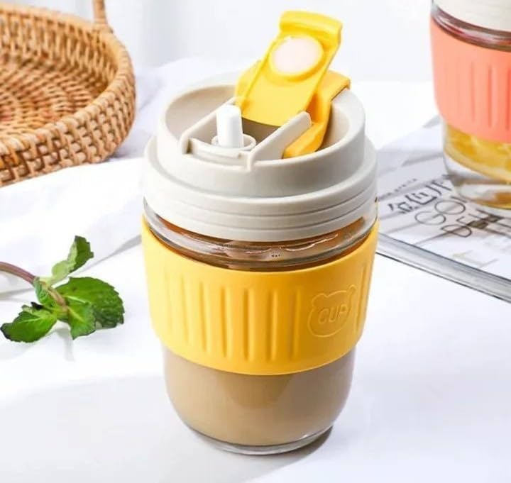 Generic - جيني زجاجة مياه زجاجية بغطاء سيليكون وماصة، كوب 350 مل، 2 في 1 للشرب المباشر وماصة، اصفر .ام كيه