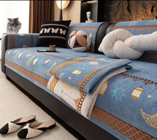 Generic - طقم أغطية أريكة من قماش غوبلان الكتاني - بتصميم رمضان - طقم من 10 قطع مع غطاء أريكة كبير وغطاء أريكة صغير وغطاء لأريكة من مقعدين - 6 أغطية لمسند الظهر - قابل للغسل وإعادة الاستخدام (أزرق)