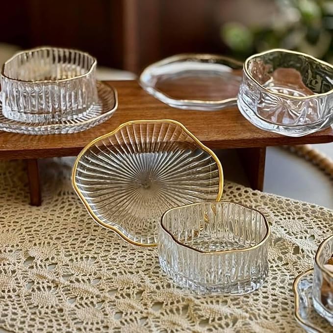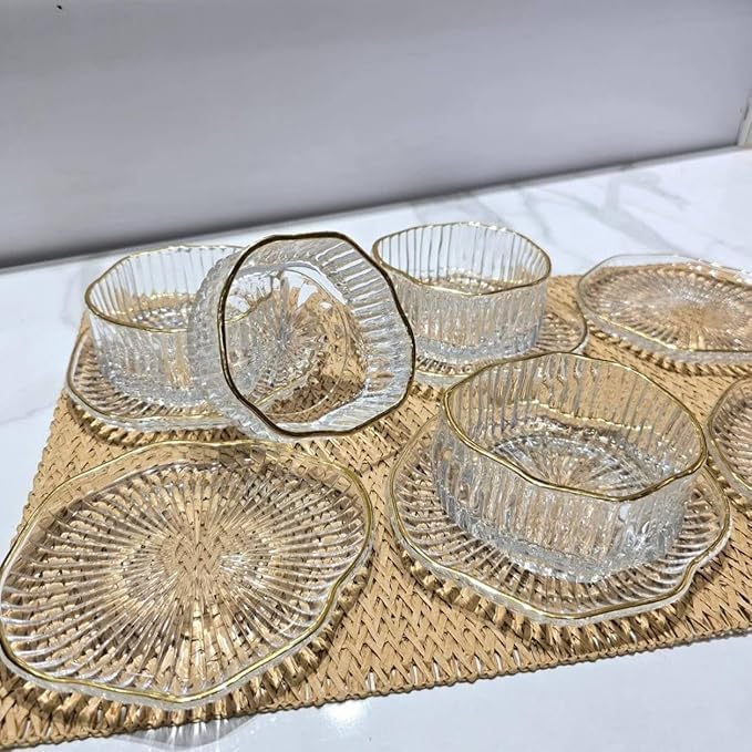 - COMPLETE 12-PIECE SET: Includes 6 elegant ribbed glass bowls and 6 matching plates with sophisticated gold-rimmed edges, perfect for serving desserts and appetisers