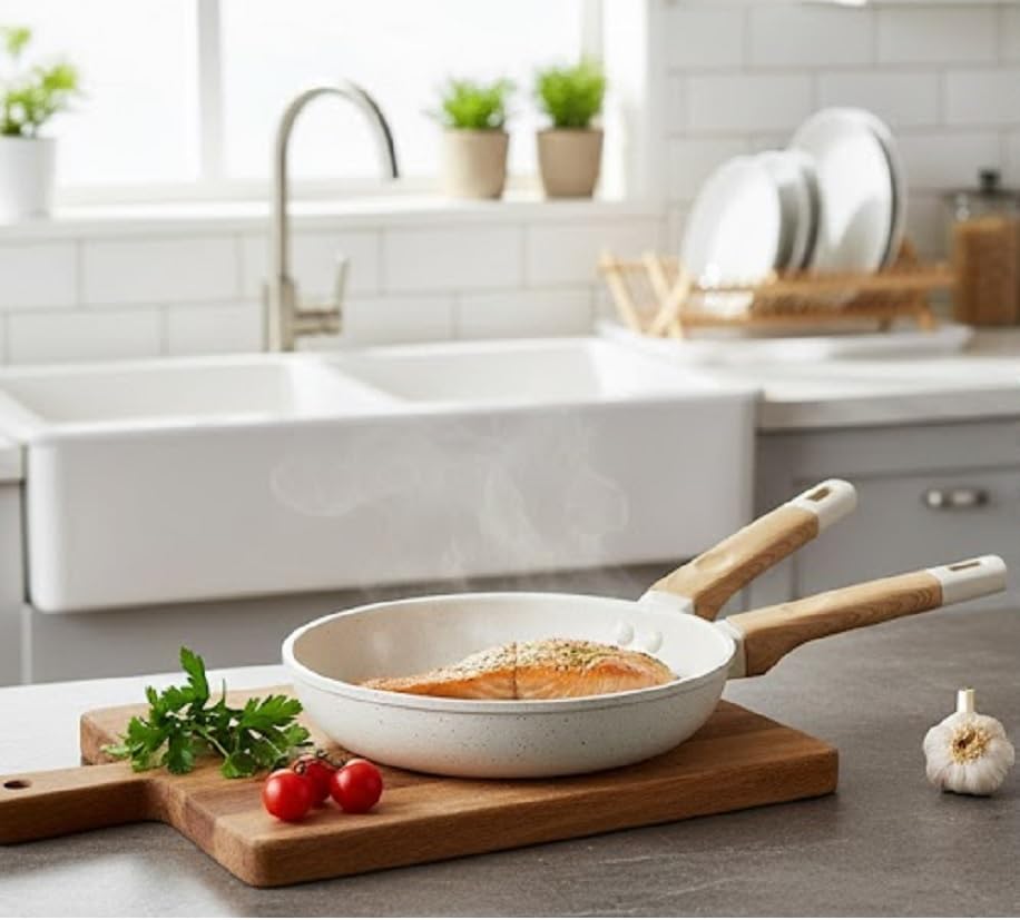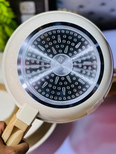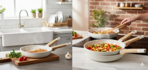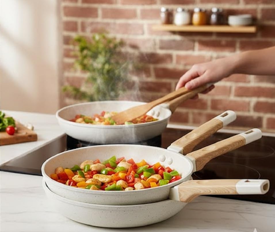 - طقم طاسة قلي من 3 قطع: يتضمن ثلاث طاسات قلي غير لاصقة بأحجام مختلفة بطلاء جرانيت، مثالية لإعداد وجبات مختلفة من البيض إلى الأطعمة المقلية في مطبخك اليومي.