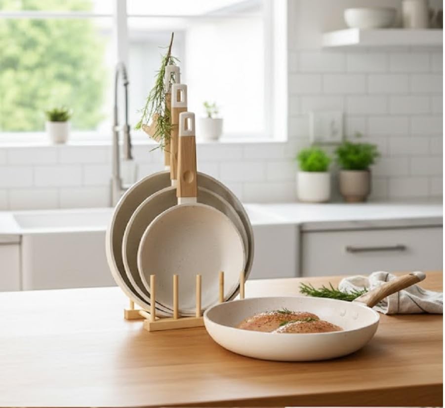 - مقابض مقاومة للحرارة: مجهزة بمقابض مريحة بتأثير خشبي مصممة لتبقى باردة أثناء الطهي، مما يوفر قبضة آمنة وتحكمًا آمنًا أثناء إعداد أطباقك المفضلة.