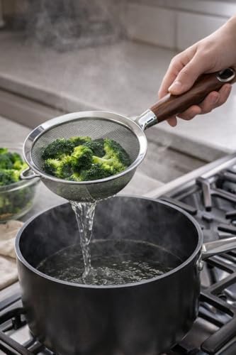 - PREMIUM CONSTRUCTION: Handheld kitchen strainer features a durable stainless steel mesh head with fine perforations for fast and efficient draining of pasta, vegetables, and other foods