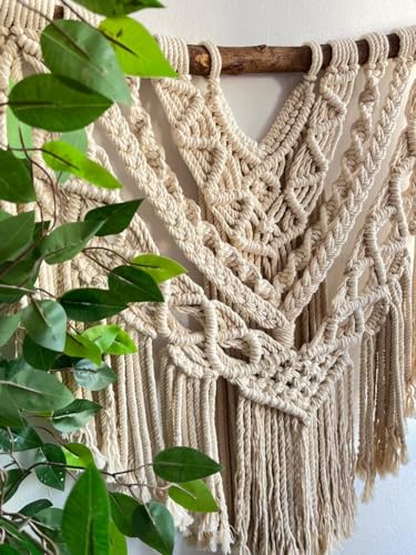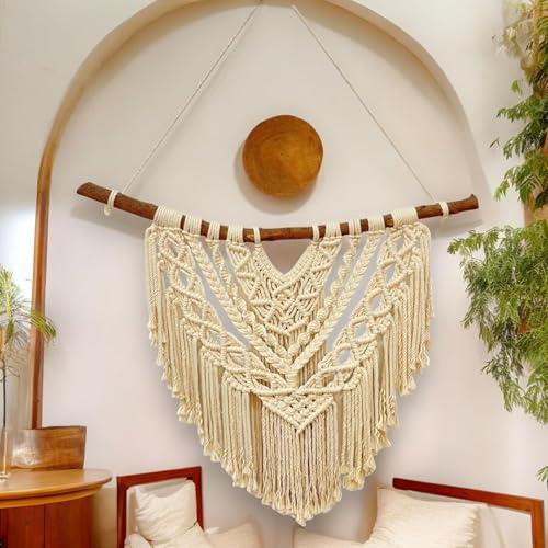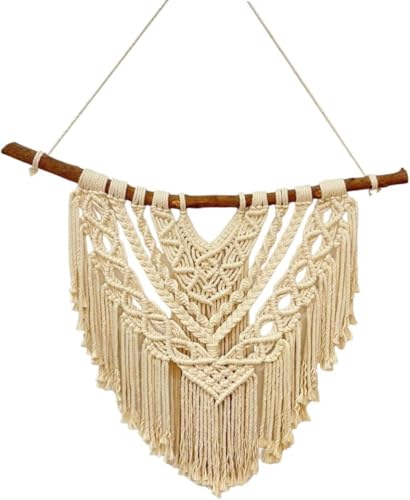 Generic - جيني مكرمية يدوية الصنع للتعليق على الحائط، مصنوعة من القطن الطبيعي، لوحة فنية جدارية بوهيمية مع فرع خشبي، 95 × 70 سم، نسيج منسوج لغرفة المعيشة وغرفة النوم وديكور المنزل