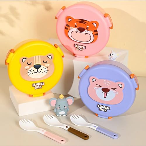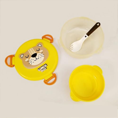 Generic - Generic Kids Animal Design Round Lunch Box with Spoon, Fork, Airtight Clips, Yellow Lion Container, 3-Compartment Bowl for Children .db