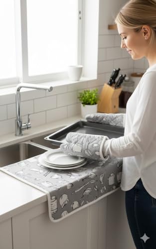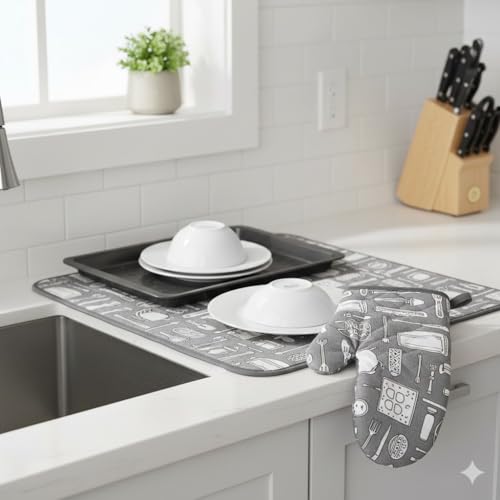 - حماية متعددة الاستخدامات: يحمي حامل القفازات والصينية المقاوم للحرارة اليدين والأسطح من الأواني الساخنة والمقالي وصواني الخبز بينما يوفر البساط منطقة تجفيف آمنة