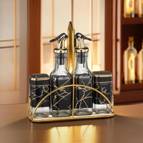 Generic - Generic Luxury Glass Condiment Set with Gold Stand, Marble Pattern, 4-Piece Oil and Salt Shaker Set, 500ml Capacity .db