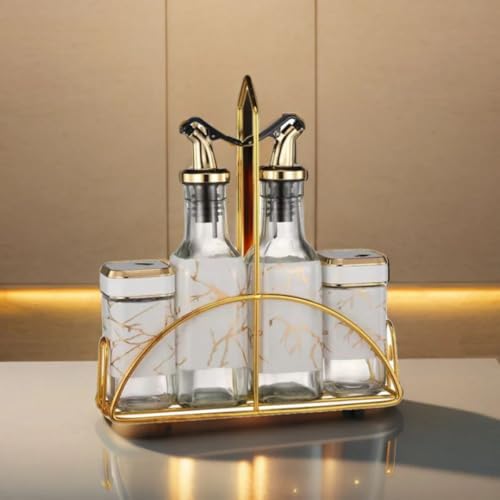 - ELEGANT DESIGN: Luxurious 4-piece glass condiment set featuring sophisticated marble pattern design and premium gold-finished metal stand for an elevated dining experience