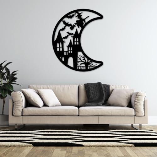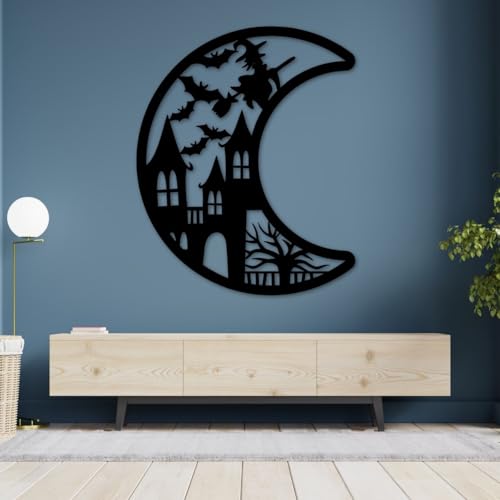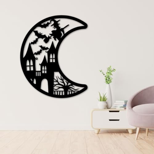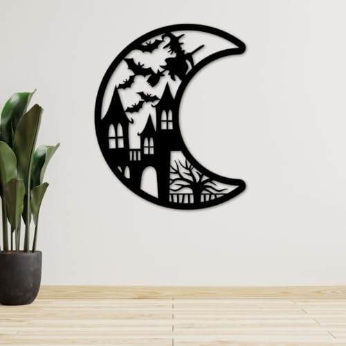 - DESIGN: Haunting Halloween-themed mdf wall art featuring a crescent moon silhouette with a spooky haunted house and flying bats design