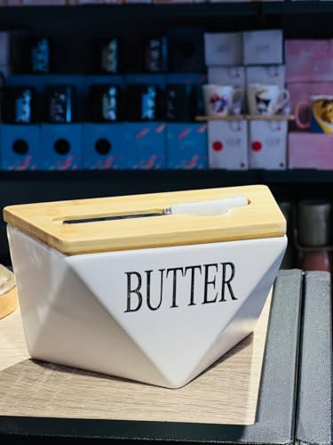- مجموعة كاملة: تتضمن وعاء زبدة من السيراميك وغطاء من الخشب يمكن استخدامه كلوح تقطيع وسكينة زبدة من الفولاذ المقاوم للصدأ