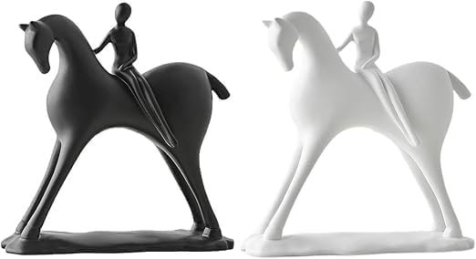 - DESIGN: Elegant modern sculpture featuring a sleek black horse and rider, crafted in a minimalist contemporary style for sophisticated home decor