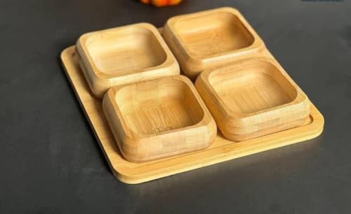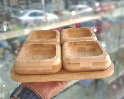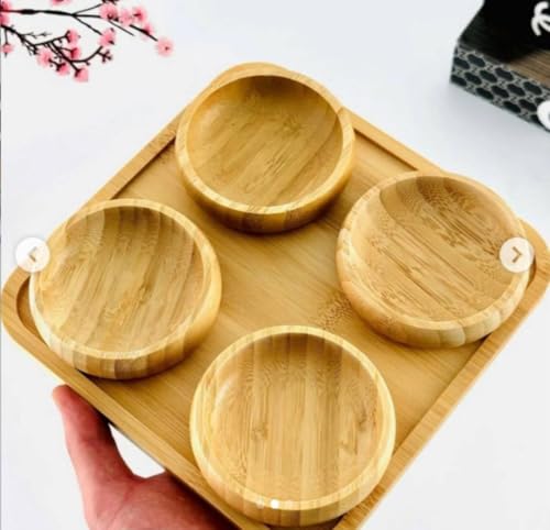Generic - جيني مجموعة تقديم من الخيزران الطبيعي، 4 قطع من اوعية الوجبات الخفيفة مربعة مع حامل، اوعية 9 سم، صينية 20 × 20 سم، مقاومة للماء .ام كيه