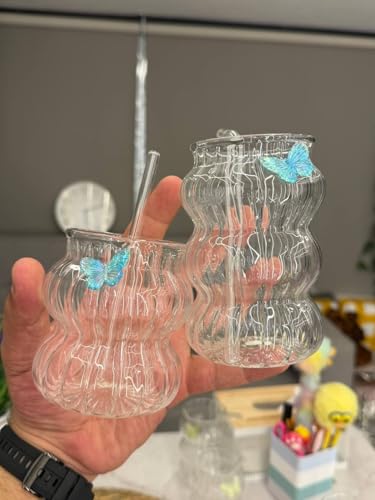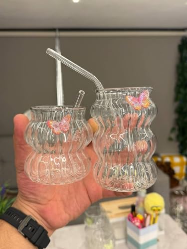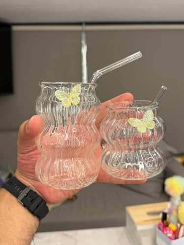 Generic - Generic New Glass Drinking Set with Butterfly Design, 2 Pieces with Straws, Polygonal Shape, Handmade .soh