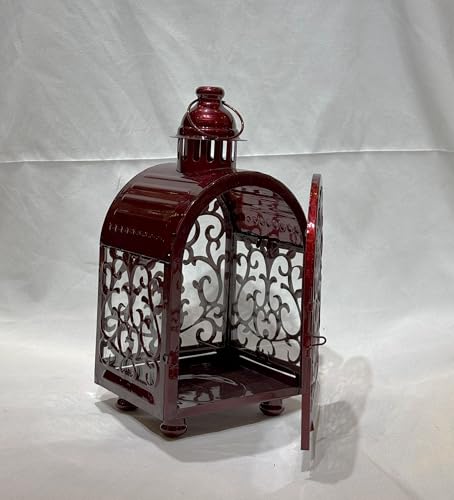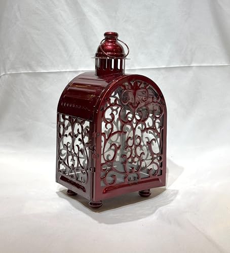 - DESIGN: Elegant burgundy metal lantern featuring intricate floral scrollwork pattern and decorative arched design