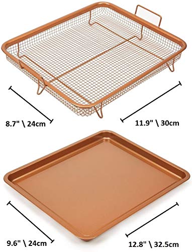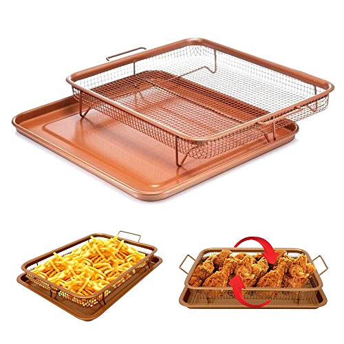 - Made of high quality metal material, safe and durable. All finishes are non-toxic, safe and Eco-friendly. Elegant copper color and stylish design. Non-stick tray, easy to clean and dishwasher safe, easier pick-and-place, enjoy a more convenient and healthy life. Perfect baking tray to cook delicious and healthy crisp or French Fries for you and your families.