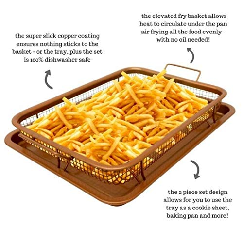 - Your 2 piece air copper crisper tray has an Elevated mesh crisping basket that allows super-heated air to pass through and circulate a full 360 degree around the food ensuring it's cooked evenly Won't dry out or over cook your food.