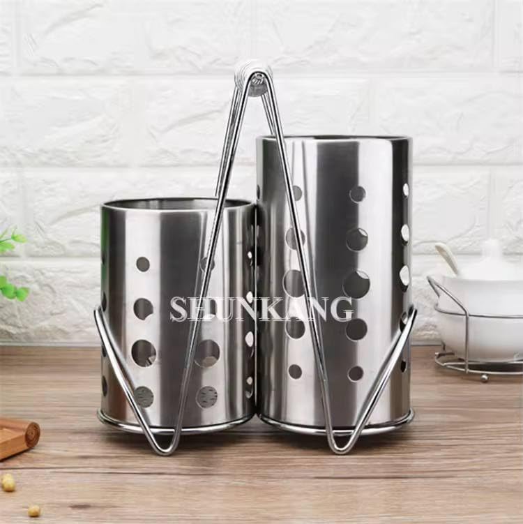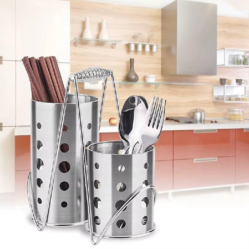 - التصميم: حامل أدوات أنيق من الفولاذ المقاوم للصدأ يتميز بنمط ثقوب دائرية مزخرفة وتصميم مزدوج لتخزين منظم