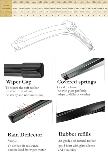 - High Performance: 0 streaks, extremely smooth, clean, vibration-free wipes. All-season wipers are made of high-quality rubber, plastic, zinc alloy materials and the most scientific aerodynamic technology, with strong detergency and wear resistance.