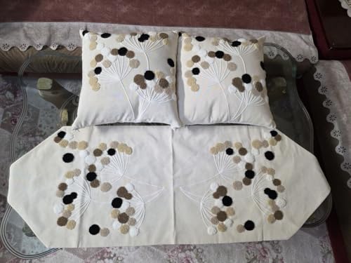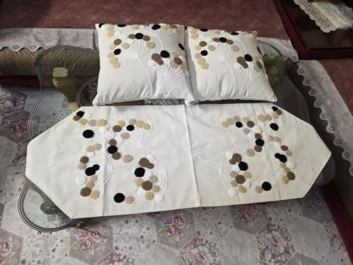 - DIMENSIONS: Table runner measures 90x45 centimetres, accompanied by two perfectly sized 45x45 centimetre decorative cushions