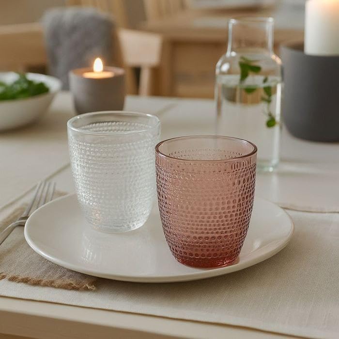 - ELEGANT DESIGN: Set of 6 textured glass drinking cups featuring a sophisticated dotted pattern in clear and rose colours, adding a stylish touch to your table setting