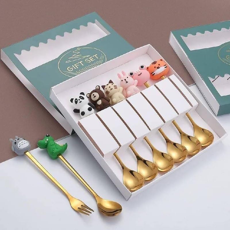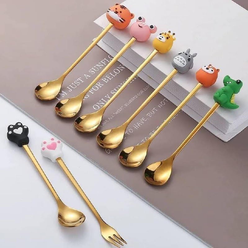 - ADORABLE DESIGN: Set of 6 gold-plated dessert spoons featuring cute animal-themed decorative handles with charming characters like panda, monkey, bunny, and more
