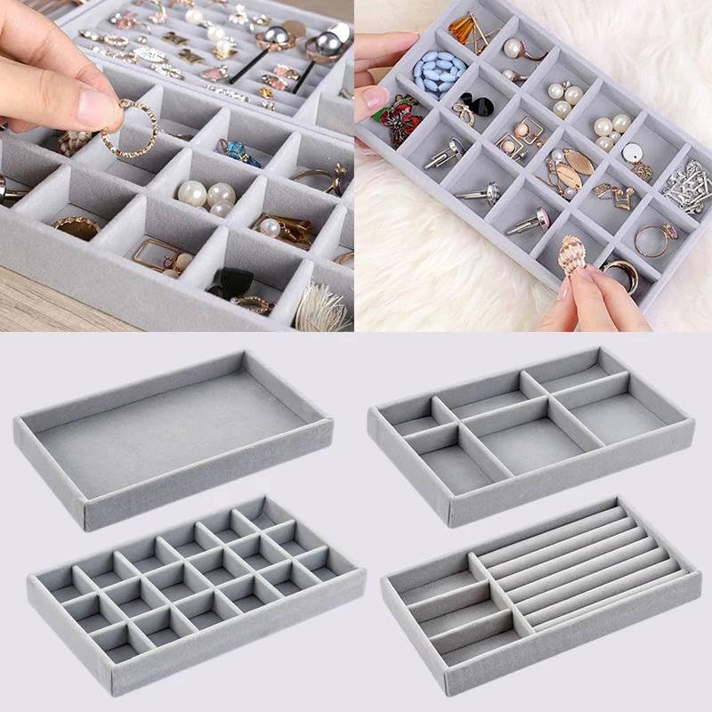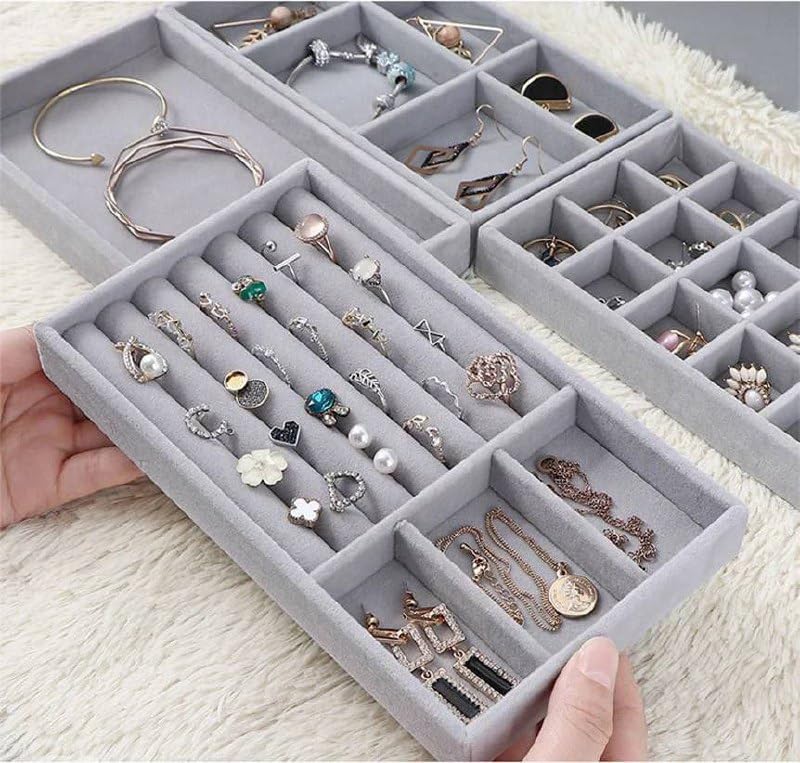 - VERSATILE DESIGN: 4-piece grey velvet drawer organiser set with multiple compartments designed specifically for rings, necklaces, earrings, and other jewellery items