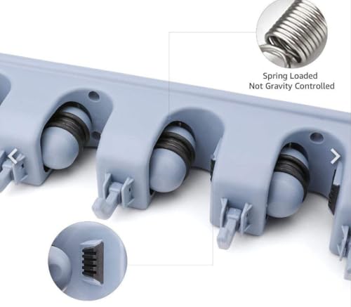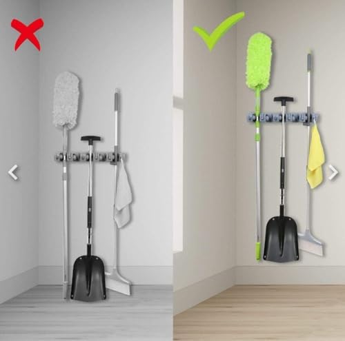 - تصميم متعدد الاستخدامات: منظم يثبت على الحائط مع 5 فتحات محملة بنابض وخطافات إضافية لتخزين المكانس والمماسح والفرش والمظلات وغيرها من الأدوات المنزلية
