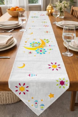 - تصميم احتفالي: تتميز بزخارف قمر ونجوم وزهور نابضة بالحياة بألوان مبهجة بما في ذلك الأصفر والوردي والأزرق والأخضر، مثالية لاحتفالات رمضان والعيد أو إضافة لمسة احتفالية إلى طاولة الطعام الخاصة بك