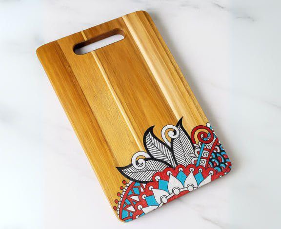 Generic - Generic Wood Cutting Board with Handle, Decorative Floral Pattern, Kitchen Prep Plank in Blue, blue and White .qu