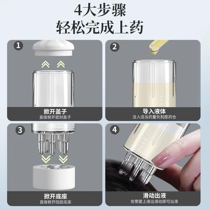 - The therapeutic comb included with the device massages hair roots and nourishes the scalp with essential oils.