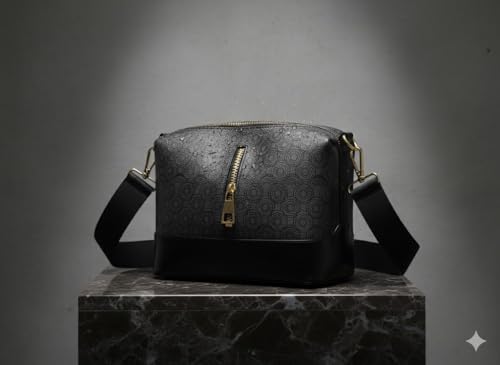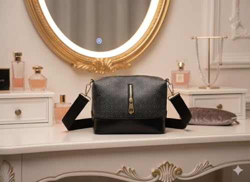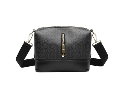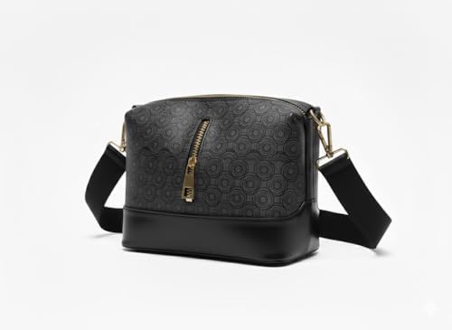 حقيبة كروس بودي نسائية بنقشة دوائر هندسية، جلد صناعي مع حزام كتف عريض قابل للتعديل وسحاب ذهبي، أسود ورمادي