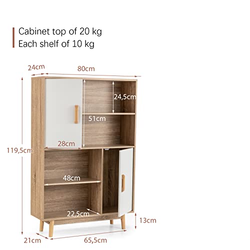 GIANTEX - جيانتيكس خزانة غرفة المعيشة، خزانة كتب، رف قائم ببابين و4 رفوف مفتوحة، خزانة جانبية، خزانة جانبية، رف خشبي، رف تخزين، غرفة المعيشة، 80 × 24 × 119.5 سم