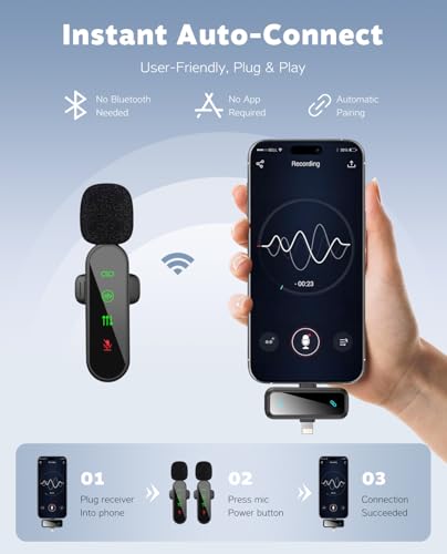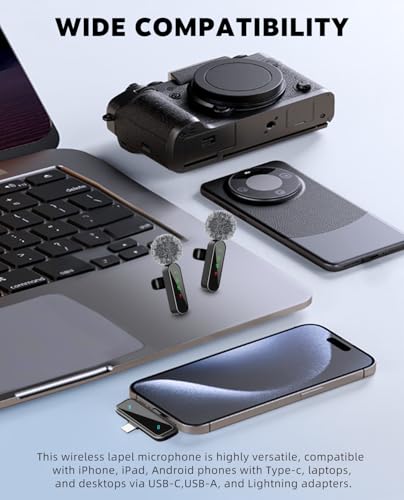 - 【Seamless Connection】- This wireless mini microphone comes with a 2-in-1 receiver, compatible with iOS and Android systems. This Bluetooth lavalier microphone is compatible with all iPhone and iPad series, including iPhone 14 and below, as well as the latest iPhone 15,16,17 series and iPad series equipped with Type C interface. In addition, it is also compatible with laptops and tablets.