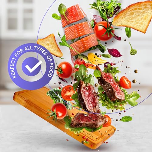 - ✅ ATTRACTIVE DESIGN - DOUBLE SIDED USE These wooden chopping boards are versatile: one side features a juice groove that is ideal for preparing chops, cutting meat, steak, chopping vegetables, fruits and bread. The other side has a smooth surface that is perfect for serving and displaying charcuteries, cheeses and vegetables as a stylish deli board.