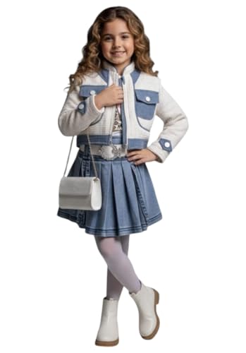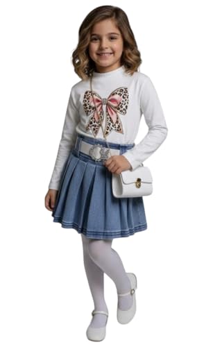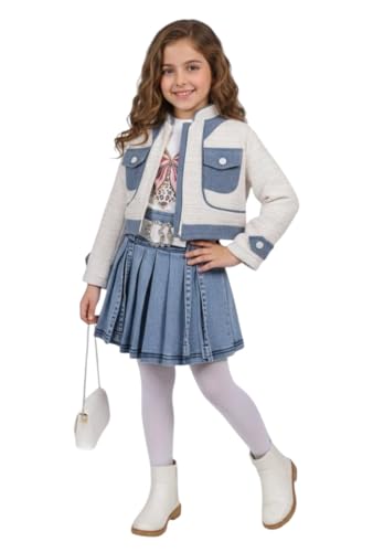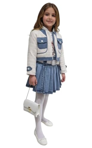 Generic - Girls Denim Pleated Skirt with Tweed Jacket Outfit, Blue and White, 3-Piece Set with Leopard Bow Top