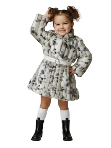 Generic - معطف بتصميم فستان من الفرو الصناعي للبنات بنمط رمادي وأبيض وكم طويل وحزام، زي شتوي