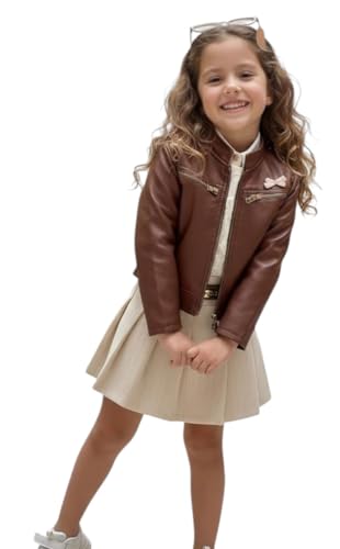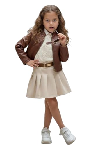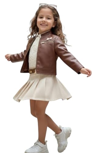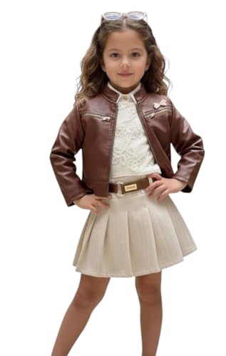Generic - ملابس للبنات وطقم مكون من جاكيت من الجلد الصناعي مع جيبة بكسرات، 3 قطع