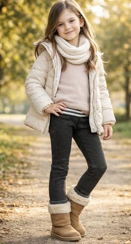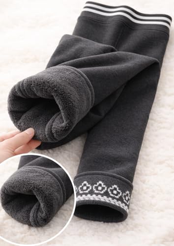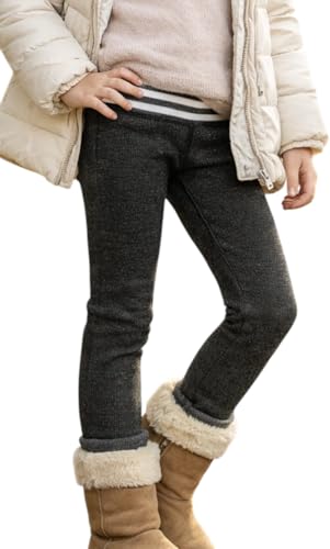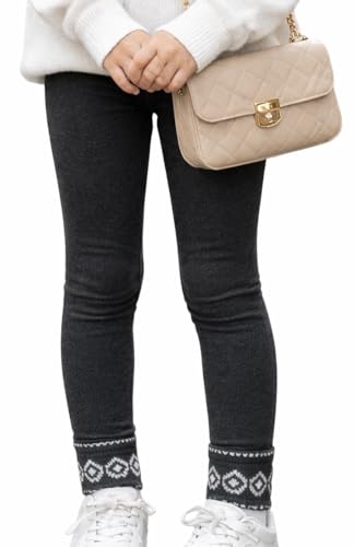 Generic - Girls Fleece Lined Leggings, grey with Geometric Pattern Hem, Striped Waistband, Winter Warm Pants, Size 6-8 Years