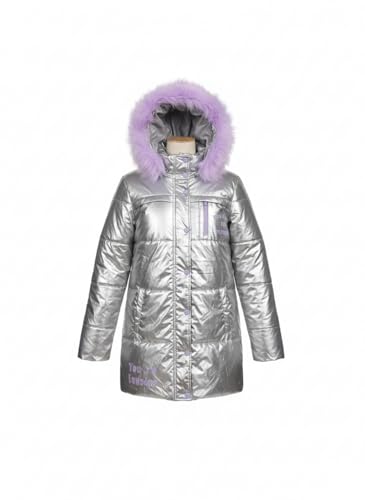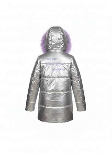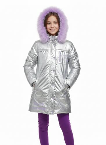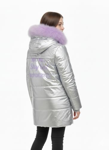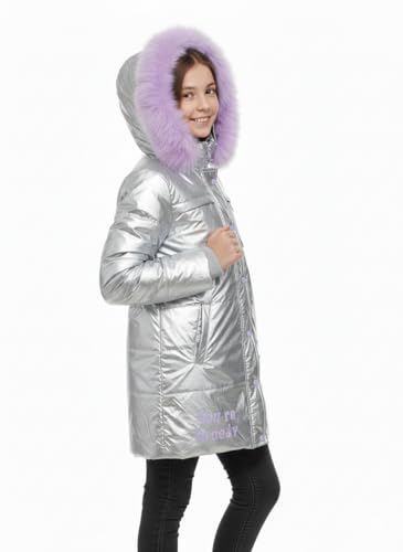 Generic - Girls Long Metallic Silver Bomber Jacket 5-12 Years Old - Warm Thermal Fiber Lining Winter Coat - Rainproof Waterproof Purple Fur Hood - Fashion Windproof Winter Clothes