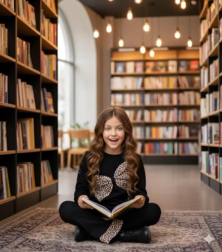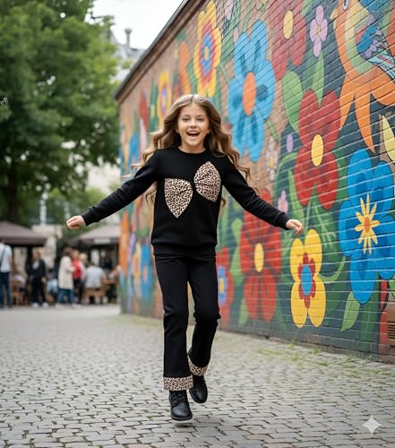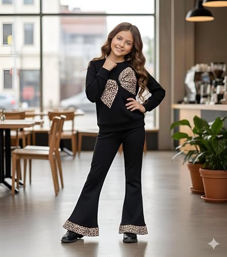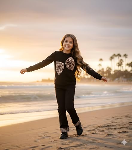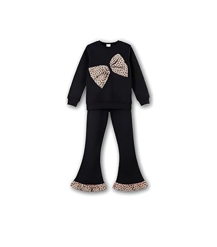 Generic - ملابس نوم انيقة للبنات - طقم اسود من قطعتين مع فيونكة بطبعة جلد الفهد، سويت شيرت باكمام طويلة وسروال سفلي على الجرس، ملابس كاجوال ومريحة للعب اليومي والاسترخاء، تنبيه عصري