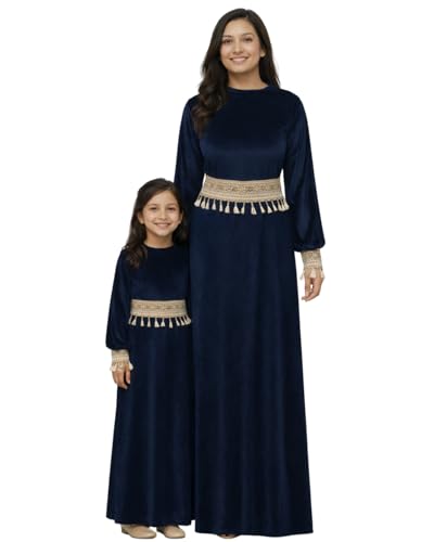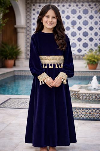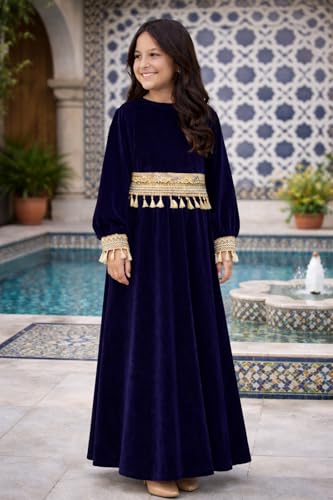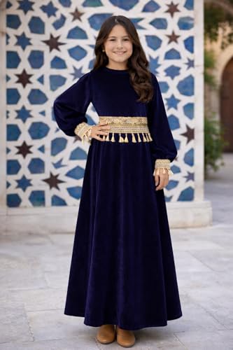 Generic - فستان رمضان من القطيفة لبنات مع حواف بشراشيب منفصلة، عباية إسلامية بأكمام طويلة، فستان طويل محتشم تقليدي للأطفال