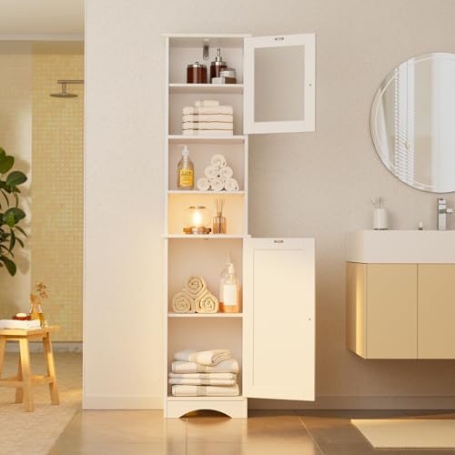 - [Tall Linen Tower Design]: The dimensions of this storage rack are 11.8 inches deep * 15.7 inches wide * 67.2 inches high, which maximizes your storage space without taking up too much of your area. The exquisite white finish gives the overall visual experience of a mid-century modern style. The top cabinet door is frosted and transparent, making it easy to see the items stored inside.