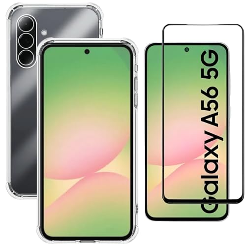 GL cases - جراب A56 لسامسونج A56 رفيع شفاف مضاد للصدمات من السيليكون المقوى من جي ال كيسيس، شفاف ومرن ومضاد للصدمات لحماية الكاميرا + شاشة حماية لسامسونج جالاكسي A56، زجاج تغطية كاملة ثلاثية الأبعاد