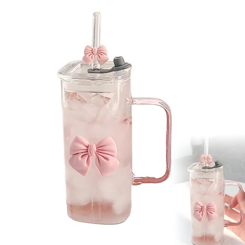 Generic - Glass Cup - Square Transparent Design with Bow, Lid, Handle, and Straw, High/Low Temp Resistant Mug for Milk, Juice, Coffee, Tea, Perfect for Home and Office Use